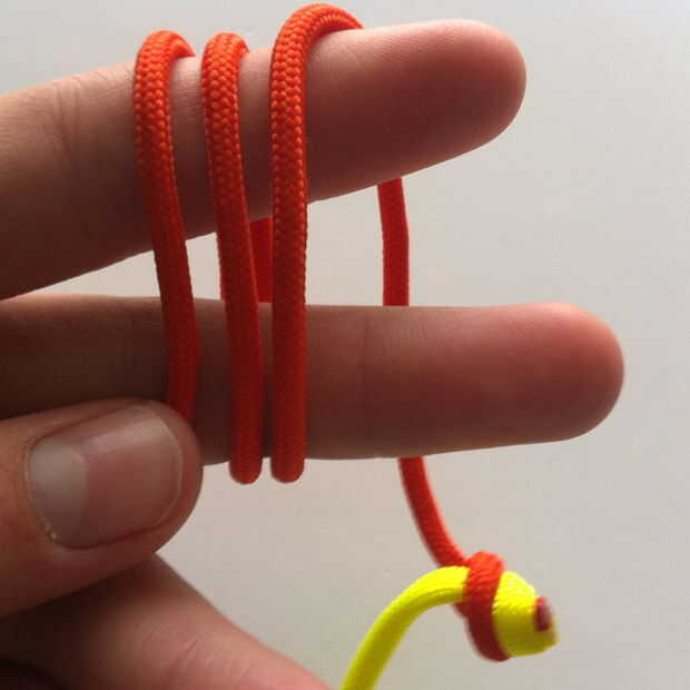 Deslice los dedos hechos uno de los cordones, aproximadamente 15 pulgadas y comienzo dando vueltas el cable alrededor de dos dedos de split. Envuelva alrededor de tres veces.