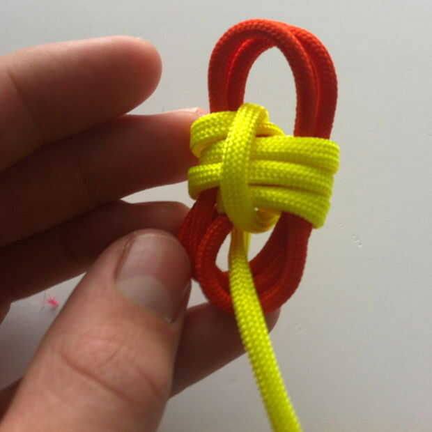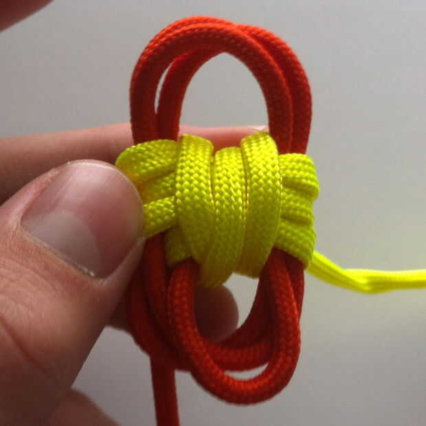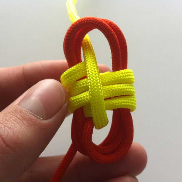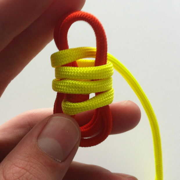 Deslice el lazo de los dedos. Entonces empezar dando vueltas al final corriendo lejos de usted y alrededor de las bobinas horizontales. Asegúrese de empezar dando vueltas de izquierda a derecha, hasta que ha hecho tres círculo, vertical a las bobinas horizontales.