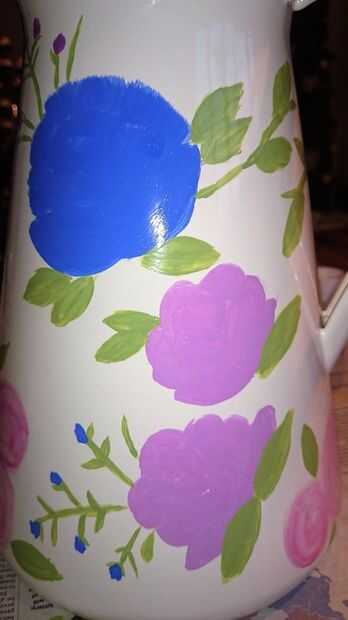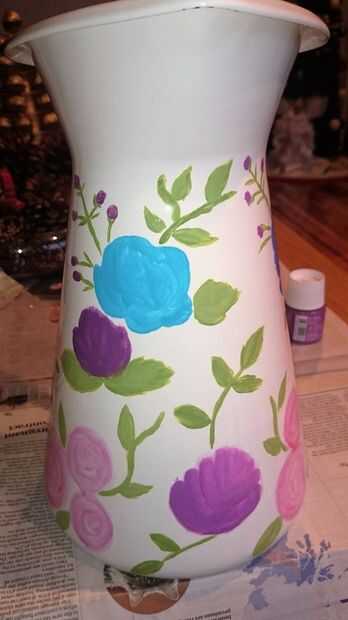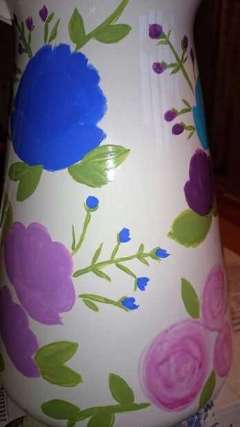 Comience agregando un poco de blanco para aclarar los colores estándar y pintar las formas básicas de las flores en la jarra. Formas básicas de flores, hojas y vides hará el truco.