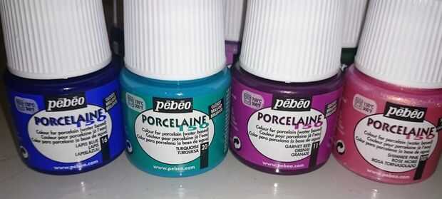 -Pintura cerámica - recomiendo la Pébéo Porcelaine 150 gama de pinturas que son específicamente para la cerámica. Para mantener los costos bajos compran tres o cuatro colores vibrantes junto con uno negro y uno blanco para crear tonos más oscuros y más ligeros para destacar y que.