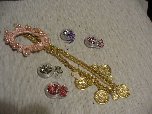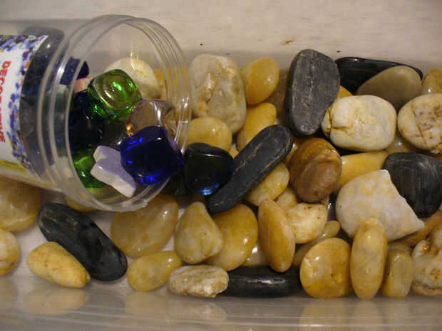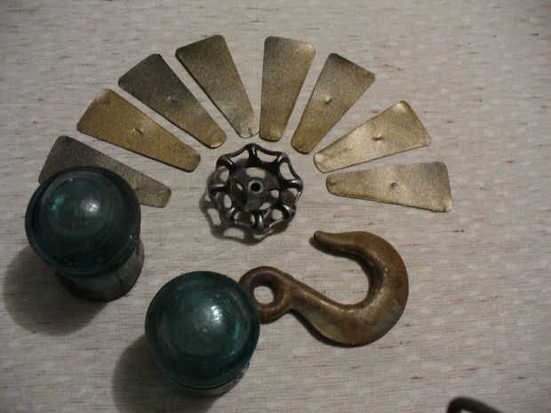 Variedad de adornos (ejemplo: pintura de aerosol, aisladores de vidrio, manija de grifo de agua, gancho de remolque pequeño, piedras [río, vidrio, decorativas y], gemas de clavo de dedo, granos [de lazo], mini monedas [de garaje venta collar])