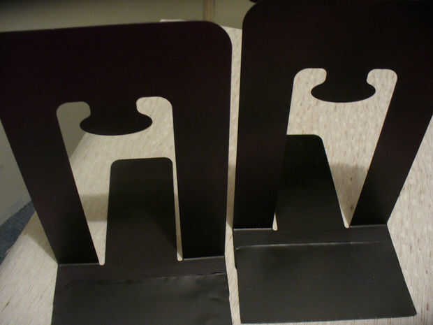 Quería ampliar la superficie de la decoración de mi sujetalibros, así que corte personalizados piezas de chapa de acero se superponen la horizontal original y hacer el total de la superficie aproximadamente 3" profundidad. Las extensiones se unen con epoxi, con abrazadera y luego permite curar durante la noche, aerosol pintado de negro.
