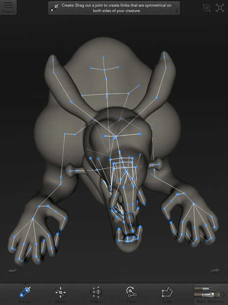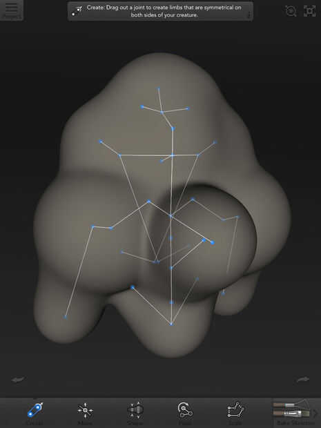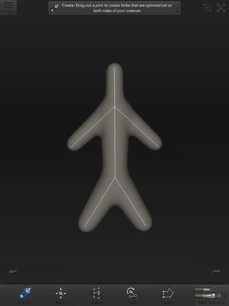Una vez decidí cómo quería el diseño parece empecé con seleccionar el botón 'crear nuevo' y alterar el esqueleto. Para comenzar con le dan una forma muy básica para jugar con. Puede crear y quitar apéndices y manipular estas moviendo, formar, posando y escala, sin embargo la simetría del esqueleto no se puede cambiar o eliminar.