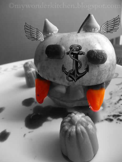 Poner dos granos dulces como dos dientes de vampiro en el extremo y roto en el medio.
