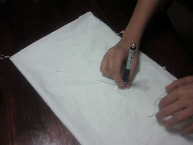 poner esto en la mesa y cinta adhesiva un pedazo largo de hilo a la parte superior donde se encuentran los pliegues