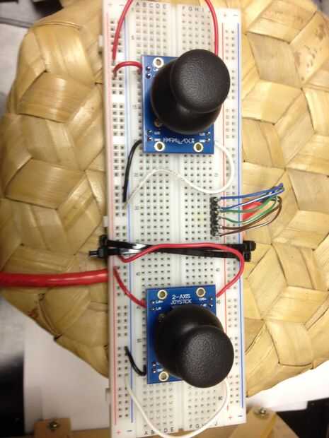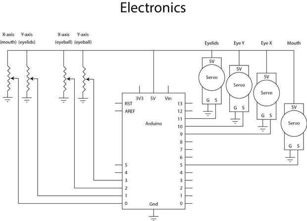 Conectamos todos los cables de alimentación para los servos usando un protoboard. Conectamos el conector de señal de cada servo a salidas digitales del Arduino (ojo eje x, pin digital 9; eje y ojo, digital 10; los párpados, digital 11; y boca, 5 digital). Utilizamos otro protoboard para armar un controlador. Un joystick de 2 ejes proporciona movimiento de ejes x e y del ojo. El segundo joystick controla los párpados y la boca. Nos unimos a las breadboards mediante un cable con los conectores quitados. La Junta de la palanca de mando conectada a las entradas analógicas del Arduino (eje x ojo, 2 analógicos eje y ojo, analógica 3 párpados, analógica 0; boca, 1 analógica).
