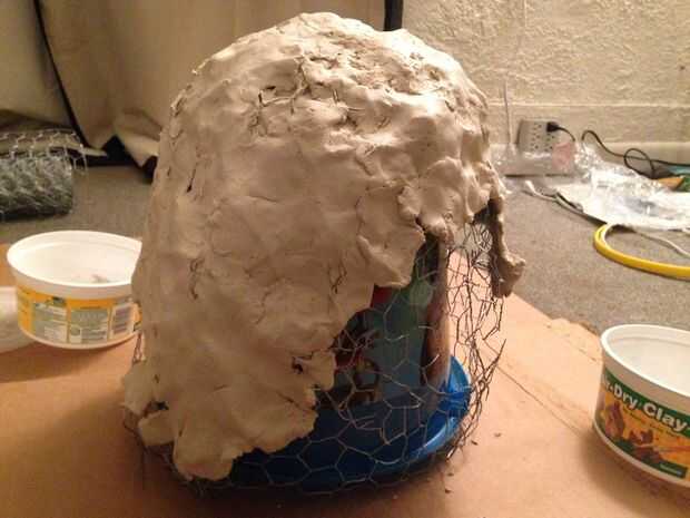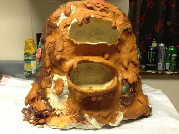 Para hacer una piel flexible para el animatronic, primero teníamos que hacer una escultura. Para ahorrar dinero se construyó la forma de un cubo y una bola y entonces envuelto alambre alrededor de eso. Luego tomó arcilla barata y hecho una capa base para trabajar de. De esta capa, construimos el detalle y las características del monstruo.
