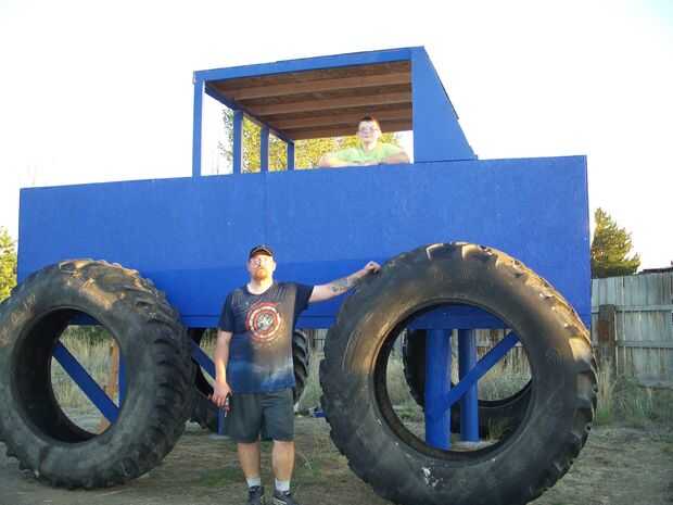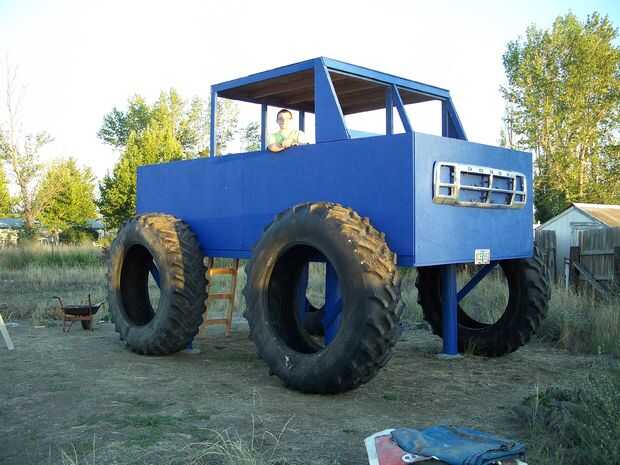 la fortaleza de juego de carro de monstruo es algo yo y mi hijo hemos estado hablando desde hace varios años y después de llegó a mis manos en un conjunto de seis pies de los neumáticos del tractor alto tenemos que hacerlo realidad, así que dibujó un áspero conjunto de planes y se inició. Puse cuatro postes en concreto, se utilizan algunos registros de la propiedad de un amigo y construyó una plataforma elevada en los postes. El cuerpo del carro fue enmarcado para arriba con 2 x 4 escota en madera contrachapada y pintado. Se construyó una puerta trampa en el piso de la plataforma, y se hizo una escalera de 2 x 4. Lag empernado los neumáticos a la plataforma de fort camiones monstruo, llenamos la parte inferior de los neumáticos con la arena, por lo que mi hijo podía jugar con sus juguetes en ellos.