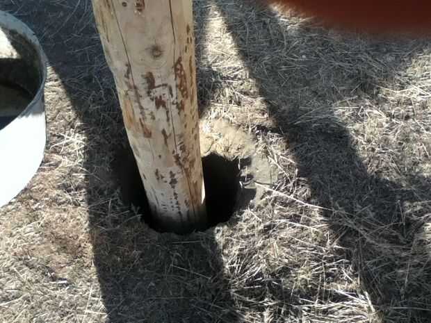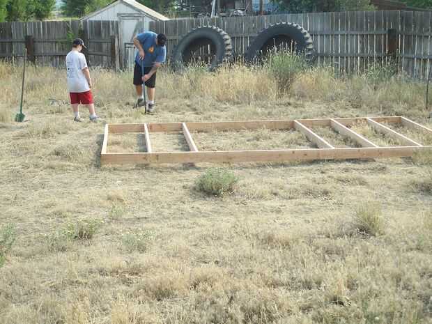 Builft parcialmente el marco para la plataforma y se utiliza para marcar la ubicación de los agujeros de poste.  Había cavado profundos hoyos de 3 pies y coloque los postes en posición.  Hicimos nuestro mejor esfuerzo para obtener el nivel de registros y la Plaza y llena los huecos con más o menos 4 bolsas de cemento por agujero.