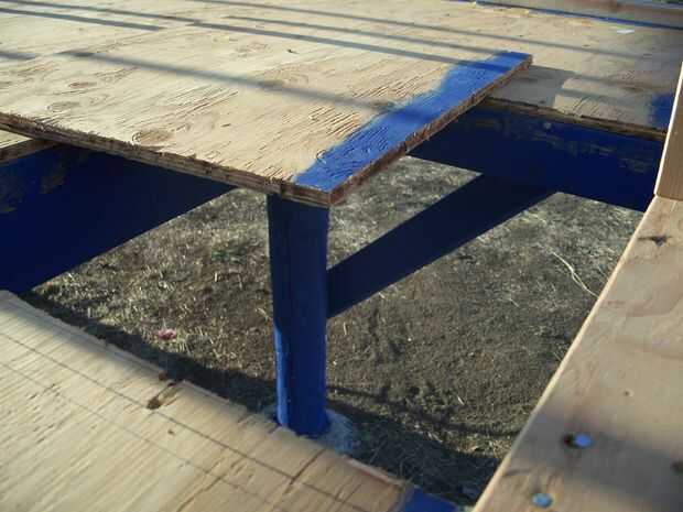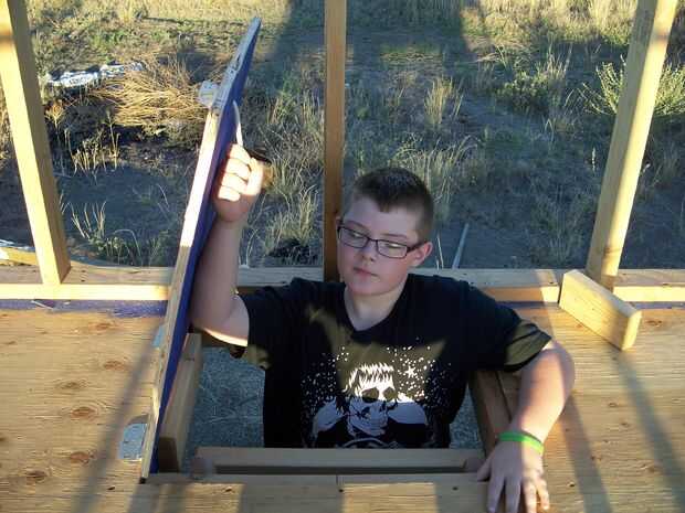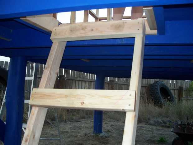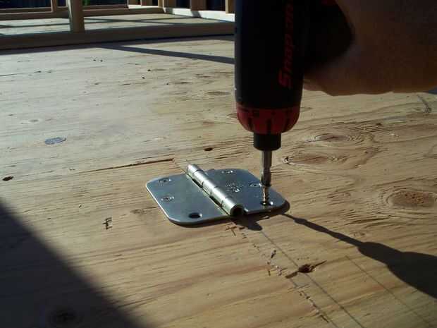 Usando los refuerzos añadidos entre las vigas del marco como guía corta la trampilla del piso de madera contrachapada. La caja la abertura en el piso.  Colocar el corte atrás y añadir las bisagras.  Taladre un agujero en la trampilla en el lado opuesto de las bisagras, un pedazo de cuerda a través del orificio de la secuencia y atar nudos en los extremos de la cuerda para hacer una manija de la puerta puede abrirse desde el interior de la fortaleza.  Una escalera fue construida y agregada debajo de la trampilla.