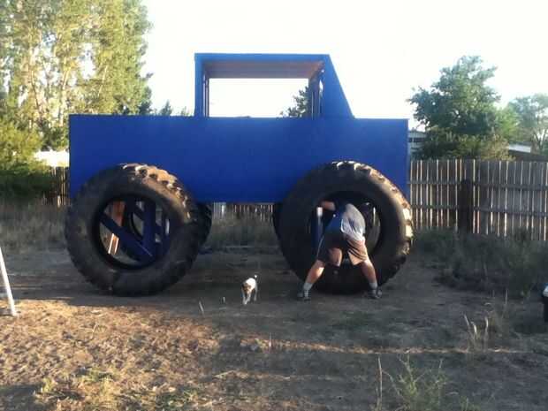 Los neumáticos del tractor fueron rodados en su lugar y lag atornillados en 3 puntos para nuestro camión.  Llenamos los neumáticos con la arena, como una caja de arena improvisada.  Recuerde perforar algunos agujeros de drenaje en la parte inferior de los neumáticos antes de agregar la arena.