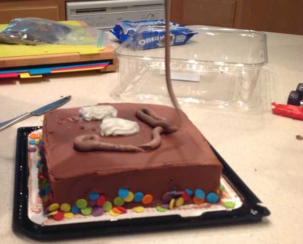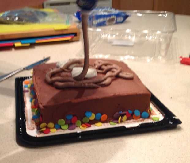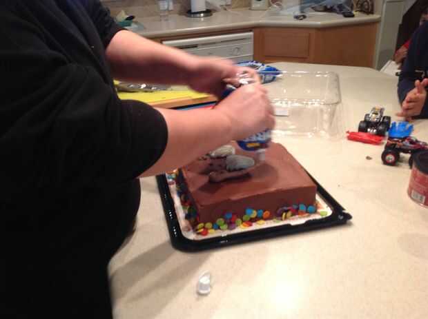 Quitar todas las decoraciones que ofende. Ofrecer al perro o niño pequeño tiene corriendo. Añadir glaseado extra... un montón de helar. Suave alrededor existente glaseado sobre el pastel. Hace montones y colinas con escarcha como los saltos poco tienen en las arenas del pozo.