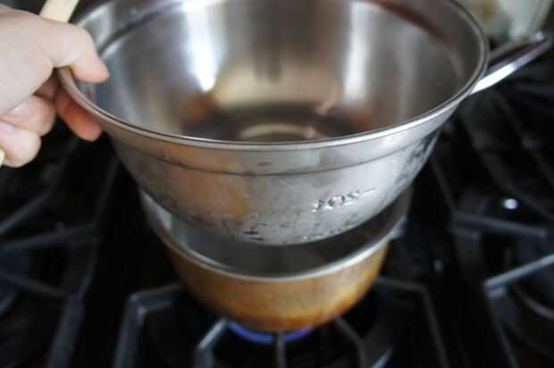 Crear una caldera doble. Llene una olla hasta la mitad con agua y llevar a fuego lento. Calor baja a media baja. Coloque un recipiente resistente al calor en la parte superior y agregue el chocolate. Revuelva suavemente hasta que el chocolate se derrita y suave.