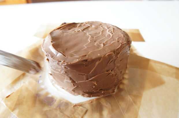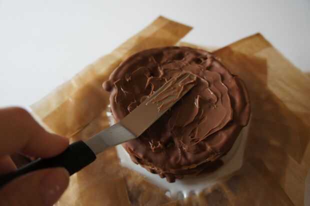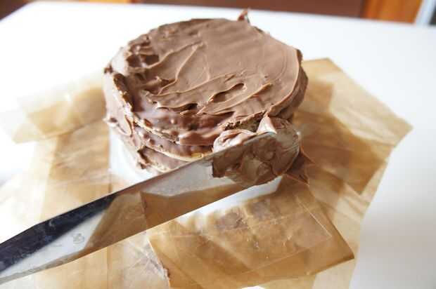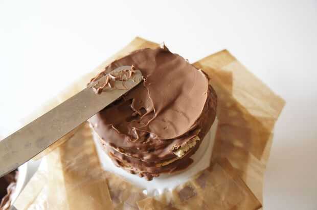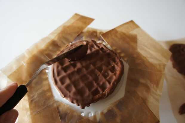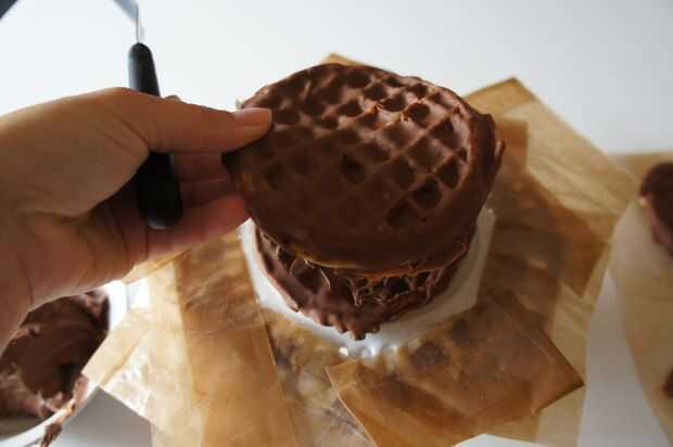 Quitar waffles del congelador. Colocar una galleta en el soporte de la torta y extender una capa de queso crema de chocolate. Repita con el resto waffles. A continuación, las heladas la tarta con el queso crema restante.