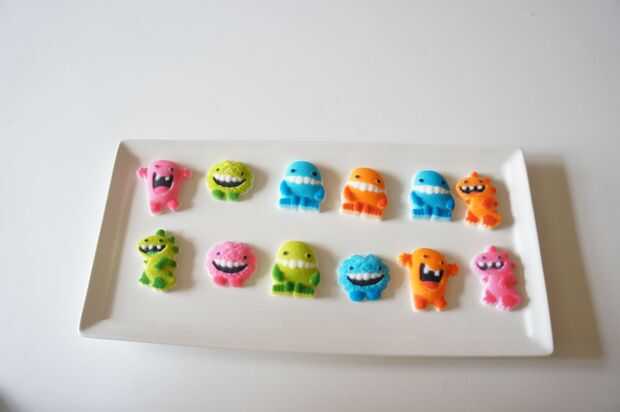 Colocar monstruos pastel y al azar agregar chispitas de círculo. Levantó uno de mis monstruos para hacer estallar hacia fuera más.