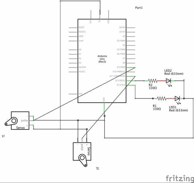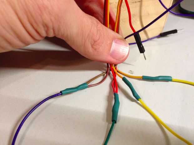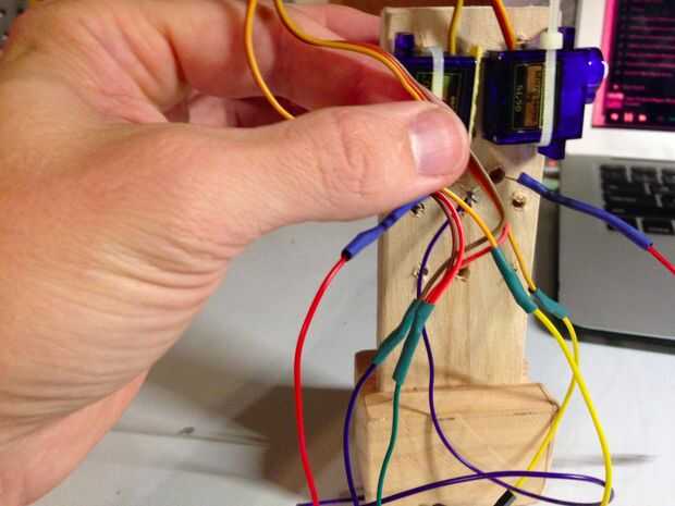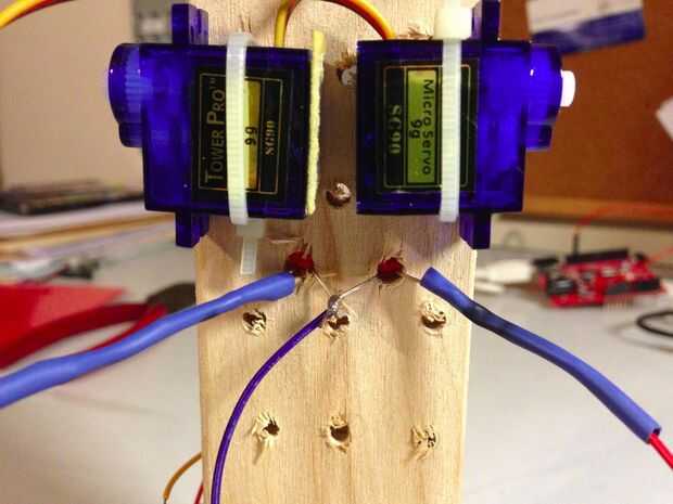 La soldadura de las patas negativas de los LEDs y conecte un cable de salto. Cubrí las patas positivas y reducir resistencias con calor. Luego le enchufamos el LED en dos clavijas de salida en el arduino. Para los dos servos me decidí a hacer algún empalme de los cables para evitar el uso de un protoboard. Después del corte y stripping, suelde los dos terrenos (marrón) juntos y a un cable de salto. Conecte a tierra. Soldadura los dos 5 voltios cables (naranja) juntos y a un salto de cable. Conecte a 5 voltios. Para cada cable amarillo de los servos, soldar cables de salto individual y conecte a los dos pines de salida separada. Encogimiento del calor de uso para proteger los empalmes.