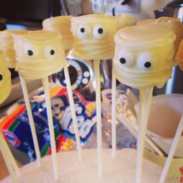 Coloque las bolas de ojo de candy mientras que el caramelo se derrite aún pegajosa. Puede pulsar en el malvavisco ligeramente para crear una acumulación por lo que aparece que el monstruo tiene párpados.