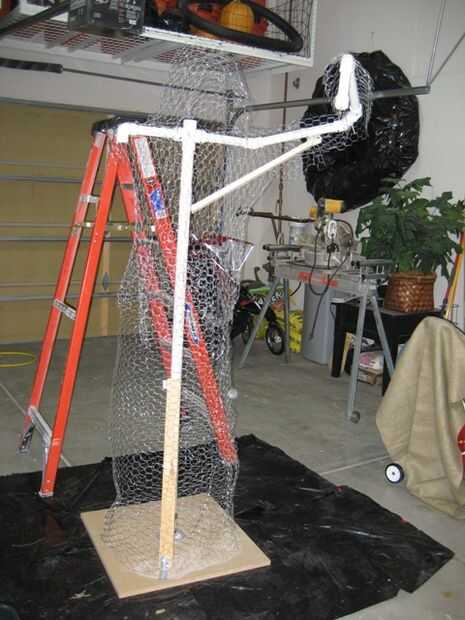 Además, ahora sería un buen momento para ejecutar cualquier cableado si vas para alambre duro una linterna o un apoyo eléctrico. A continuación, tomamos el alambre de pollo y dar el apoyo de alguna forma. Trate de usar guantes gruesos al hacerlo porque el alambre de pollo puede ser agudo. Hice un cilindro grande para el cuerpo y en forma un poco. A continuación, tomó un trozo pequeño y conectado a la parte superior para forma la cabeza. Por último, hice otra pieza más pequeña y había drapeado sobre el brazo. (La segunda foto he cambiado el soporte por lo que se oculta bajo la arpillera)