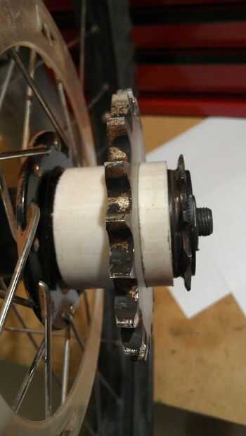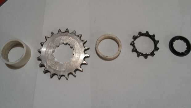 •Now que han trabajado a máquina y a mano presentaron su piñón deben comprar o hacer separadores para mantener el piñón en el lugar en el centro libre. (a menos que usted utilice un hub gratis)  Los espaciadores no tienen que ser estructural; sólo debe mantener la rueda dentada de movimiento mientras el pero sostiene que está todo en su lugar.