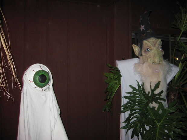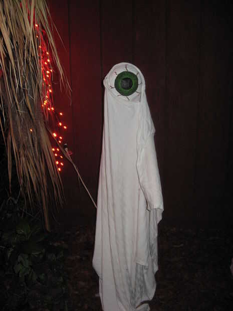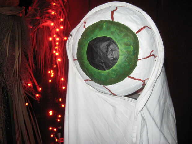 Mi globo ocular animatronic ha usado varias cosas diferentes en los años que lo tuve. Normalmente, yo simplemente cuelgue una hoja de tela le. Su primer traje era una hoja azul, pero en los Halloweens más reciente, este monstruo de globo ocular ha usado un manto blanco. Ambos se ven bien, y yo usaría todo lo que está disponible para vestir su globo ocular.