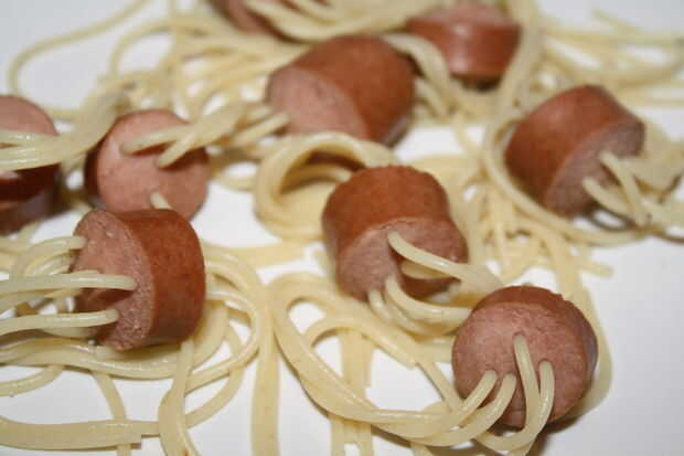 esto es algo realmente fácil de hacer y los niños pueden ayudar a hacerlo-son octopii (¿Sp?) están hechos de espaguetis sin cocer y perros calientes -Paso 1:Paso 2: Material Paso 3: construcción Cortada sus perros, cerca de 1 pulgada de largo y coloc