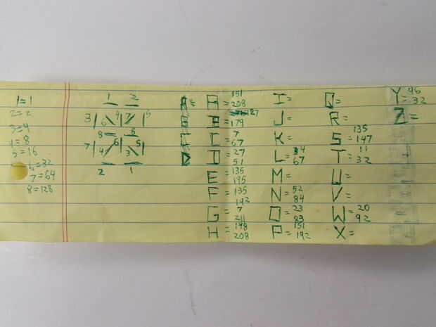 Sabiendo esto, puede asignar a los pares de LEDs en el "top" y "fondo" de la mitad de la pantalla 16 salidas individuales en los registros de dos turnos. Después de realizar estas conexiones, he averiguado qué pares de LEDs tendría que ser iluminados para mostrar la letra deseada y determinó el binario de 8 bits (y posteriormente decimal valor) necesito enviar a los registros de dos cambio para cada letra.