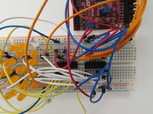 El Vcc de ambos registros de cambio fue unida a un carril de 5V y el GND y el OE (con la barra sobre) fueron atadas a un carril de tierra. 5V fue utilizado en lugar de 3, 3V porque dos LEDs son recibir una señal de cada salida, y la caída de tensión combinada a través de los LEDs está por encima de 3, 3V (para que los LEDs no se encienden), pero por debajo de los 5V.