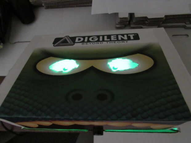 En mi protoboard, coloca los LEDs de tal manera, con los cátodos Unidos al riel de suelo, para que cuando se cierra el cuadro, la luz de los LEDs brillarían hacia arriba derecha en los ojos. Esto toma un poco de afinar para obtener sólo el ángulo derecho, pero es super cool cuando llegue apenas a la derecha. Os adjunto los ánodos de los LEDs a los pines digitales 6 y 7 para los ojos izquierdos y derecho, respectivamente, por lo que podría dar vuelta los ojos y cuando he querido a través de código escribiendo digitalmente pins 6 y 7 de alto o bajo.