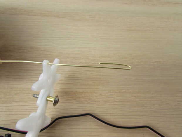 El cable sí mismo (Yo utilicé alambre de cobre amarillo suave) tendrá que ser de unos 12 cm de largo; Esto es suficiente para lo que estamos haciendo con un adicional de dos centímetros para repuesto/mess up en sin un problema. Tejido de 3 centímetros a través del orificio más lejano desde el centro del brazo en cuestión. Entonces, dos centímetros en el final, doble el alambre en forma de "U" para que puede tire el cable hacia atrás y al final pasar por el orificio más lejano segundo lugar. Use pinzas o alguna otra herramienta adecuada, para obtener el alambre empujado cuanto puedas.