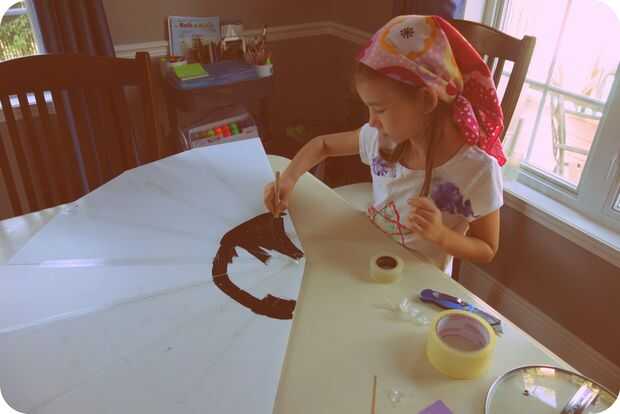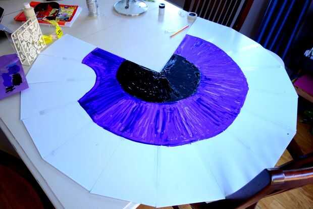 Utilicé una regla para hacer una marca en cada triángulo de 7 pulgadas desde el centro y 15 pulgadas desde el centro. Entonces conecté cada marca para hacer un círculo. El círculo interior fue pintado de negro y el círculo exterior se puede pintar cualquier color (mi ayudante le gustaba púrpura). Tenga en cuenta que eventualmente había ampliado el círculo exterior de unos 18 pulgadas desde el centro y retirar el punto de reflexión de dibujos animados. Para el iris, nos dimos cuenta que untando una capa fina de pintura dio una agradable textura radial, al igual que lo real.