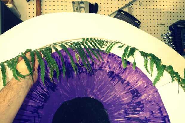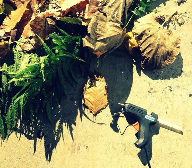 Utiliza algunos helechos del bosque atrás, cortar un lado de las hojas y caliente pegado en ambos bordes para hacer las pestañas. Para el resto de la toma del camuflaje, caliente pegué algunas hojas que hemos recolectados desde el piso del bosque.