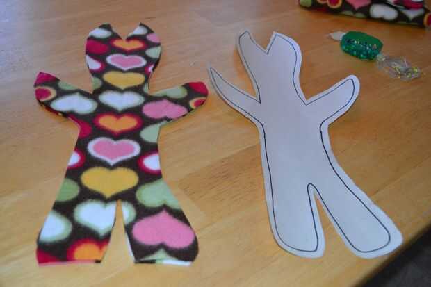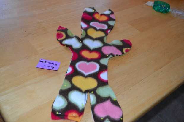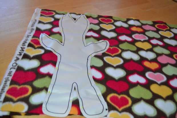 a continuación doble su tela en medio, lado incorrecto hacia fuera, borde a borde. Coloque el patrón sobre la tela y el perno a través de ambas piezas de tela. Cortar por el borde de su patrón, a través de ambas piezas de tela. Quite los pernos y el patrón. Volver a prender los 2 trozos de tela juntos alrededor de los bordes dejando una abertura lo suficientemente grande como para poner el relleno un lado.