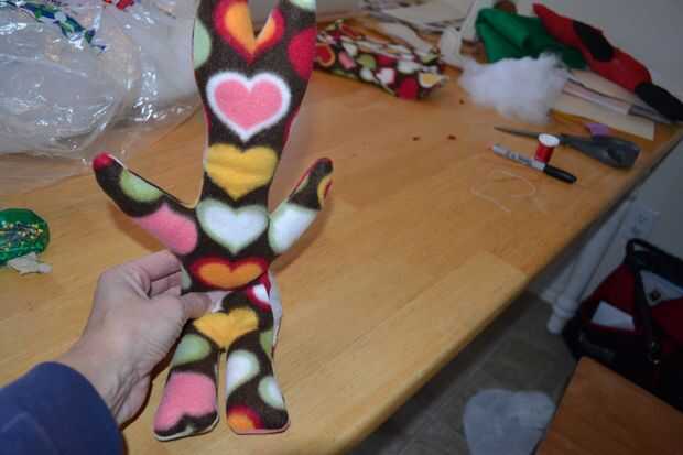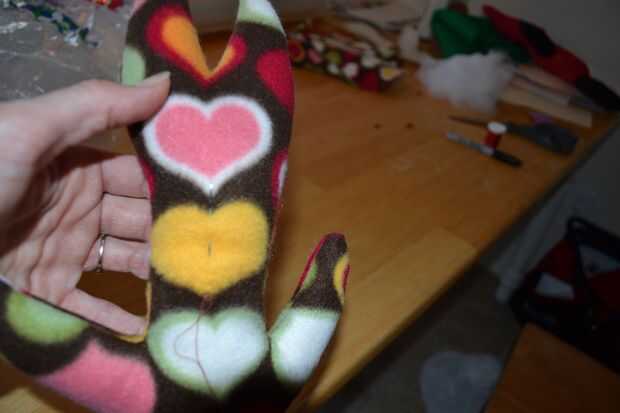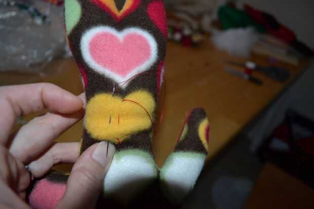 Ahora mira que es cara.  ¿Ves donde debería estar la boca? El sujetador de la tela como están pellizcando labios y va a formar un pliegue. A partir del centro del anclaje labios su hilo de rosca en la parte inferior del pliegue. Empuje la aguja a través del pliegue del labio hasta la parte superior de los labios. Vuelva a introducir la aguja en el borde superior de 1/8 a 1/4 de pulgada al lado de la primera puntada. Empuje la aguja hacia abajo y recoger algún relleno en la puntada. Esto hará que los labios completos. Empuje la aguja hacia abajo y sale aproximadamente 1/8 a 1/4 pulgada del nudo de anclaje. Ceñir el hilo para crear el inicio de los labios. Volver a entrar en labio inferior 1/8 a 1/4 del anterior punto de salida y empuje la aguja hacia arriba, reuniendo relleno y hacia fuera a través del borde del labio superior. Continuar este patrón hasta la esquina de la boca. Usted puede parar donde sientes sus labios deben terminar. Repita esta técnica que se remonta hacia el centro de los labios y luego a otro lado para crear la otra esquina. Cuando el hilo del nudo.