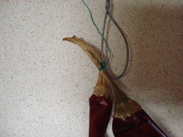 Os adjunto el tallo del Chile al alambre con un amarre de esquileo. Para ello coloque un Chile paralelo al alambre. Envuelva el tallo del Chile al alambre con 3 bucles de hilo. Luego Envuelva la rosca entre el vástago y el alambre en dos circuitos que recorren los tres primeros bucles de hilo pero no el tallo del Chile o el cable. Estos dos circuitos se llaman fraps y apriete las 3 vueltas. Después de cada Chile es azotado en, simplemente Repita el amarre en el próximo Chile arriba. Es importante establecer cada nuevo Chile de tal manera que todos los huecos están llenos de Chile. Chiles de latigazo en el cable hasta que el cuerpo es tan largo como usted quieren que sea.