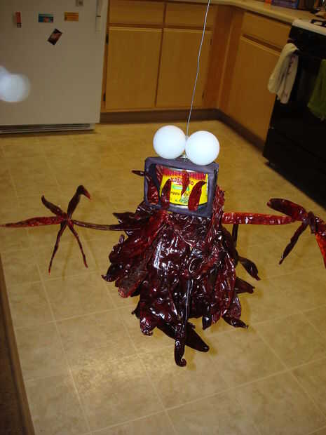 Cuando el cuerpo es tan largo como quieras y los brazos están en y cubierto es hora de hacer la boca. Quería hacer mi monstruo de Chile mira como estaba tratando de comer una lata de chiles verdes. Para empezar a tomar una lata de chiles verdes y retire la parte superior e inferior. En mi poder la cima podría ser quitada fácilmente con un abrelatas, pero el fondo no tenía el labio requerido por un abrelatas; por lo tanto en vez de un abrelatas de poder utiliza el abrelatas de mano en una navaja suiza. Si tienes un martillo y cincel que podría ser una mejor opción. Hacer que la estructura de la boca de la tapa de plástico sobre un paquete de manteca. Cortar por la mitad y pegado los dos mitades parte trasera para ajustar el ancho de la boca para hacer el Chile pueden sentirlos. Cortar la parte posterior de la boca cubierta acortamiento para que Chile pueda palillos por la parte trasera de la boca en lugar de al lado. Línea de la boca con cartulina negra; envuélvalo alrededor de la parte posterior forma labios y la cavidad bucal al mismo tiempo. El papel de construcción debe envolver detrás de la lata para que no se puede ver a través de la parte posterior de la boca. Luego la lata de pegamento caliente en la boca; poner el pegamento dentro de la lata para que no sea visible. Ser seguro para dejar espacio que puede pegar algún Chile en frente de la can para hacer dientes. Cuando el poder se pega en, cortar la tapa de acortamiento en la parte inferior de la boca sólo donde la cobertura es dentro de la lata. Esto hará que la boca caben mejor en la parte superior del cuerpo. Haga un orificio en la tapa del acortamiento en la parte superior de la boca dentro de la lata y la boca en la ristra del hilo de rosca. Los chiles en el cable forman una estructura cónica en la que se sentará la boca.