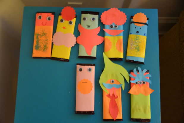 Envuelve cada barra de caramelo en papel y luego utiliza los adornos para crear cada monstruo.