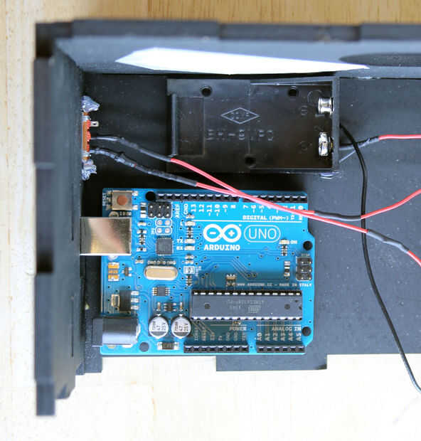 fuera de la caja) y que eran lo suficientemente largos para llegar a los otros cables. El limpiaparabrisas del interruptor que conectado al positivo en el caso de la batería y el cable restante que suelda a la línea de alimentación del circuito (uno que va al pin de Vin de Arduino y el módulo de sonido).