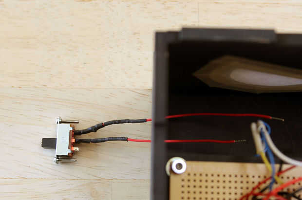 Ahora que la pared es segura, el interruptor puede soldarse en el circuito de la batería. Rosca los cables del interruptor a través de su abertura (mantener el interruptor