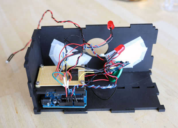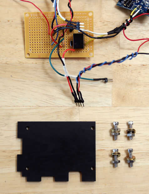 La caja tiene un estante para sostener la placa de circuito en el lugar. He utilizado unas arandelas para llenar la brecha entre la plataforma y el tablero, pero no son estrictamente necesarios. Pegué el estante a la derecha, pero empujó en la espalda (sin pegamento) así como para asegurarse de que la plataforma era recta.