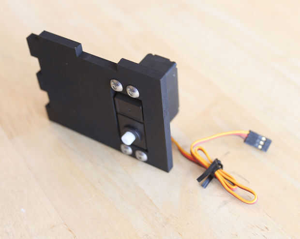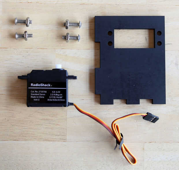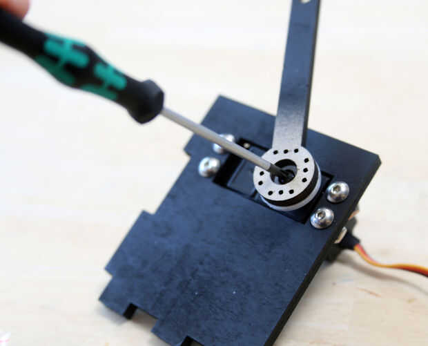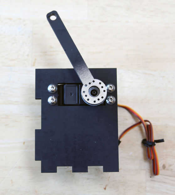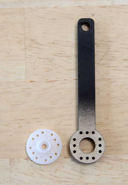 El brazo debe fijarse firmemente a la horn de servo (el pedacito plástico redondo que viene con el servo sí mismo). Lijar un poco la superficie del plástico, entonces utiliza pegamento caliente para asegurarlo. El servo viene con un pequeño tornillo para la fijación de los diversos cuernos servo que el brazo caiga.