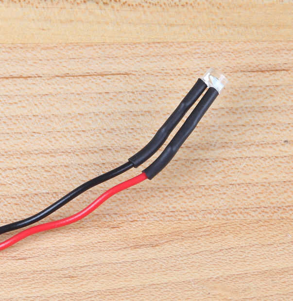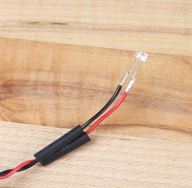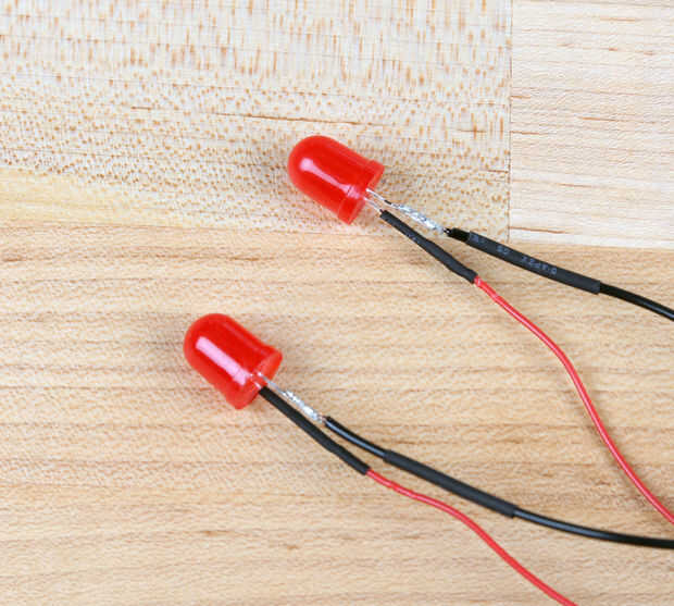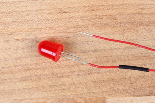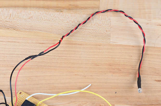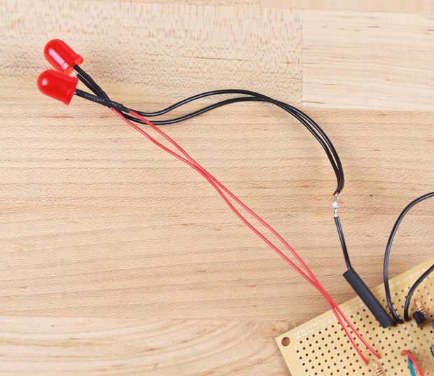 Usando los cables solo, soldado en los LED y el fototransistor. El LED sólo tiene suficiente cable para llegar a la parte delantera de la caja, pero el fototransistor se vaya fuera de la caja y necesita un largo juego de cables (~ 12 pulgadas debería ser suficientes - debe ser lo suficientemente largos para llegar debajo de la cama y ser capaces de detectar la luz ambiente en la sala). Asegúrese de que usted suelde las piezas correctamente - LEDs y los fototransistores tienen polaridad.