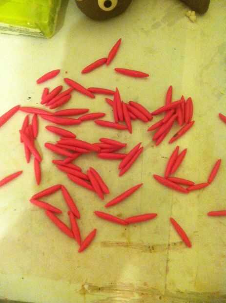 Ahora van a empezar a hacer la piel. Empezar por suavizar el color de la arcilla de elección rodando en troncos delgados y con un cuchillo o navaja corta los troncos en trozos pequeños. No todo tiene que ser del mismo tamaño, pero intentan hacerlos como como posible. Ahora esta es la parte consume tiempo, tome cada uno del corte piezas de arcilla y ambos lados de ellas para hacer un "pelo" como visto arriba del rodillo. Una vez que se les han rodado todo puede empezar a enganchar a su base.
