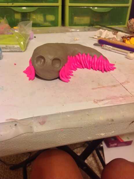 Una vez que han atado sus pelos a lo largo de la parte inferior ha llegado a la cara. Para colocar en los zócalos del ojo se le tendrá que hacer algunos pelos extra largas. Luego tomar su pelo extra largo y pegar las tapas de ellos dentro de los zócalos del ojo. Luego tomar la herramienta de la bola y ahuecar los zócalos del ojo para aplanar los pelos en su interior. Llenar el resto de la cara hacia fuera al igual que el resto de la base