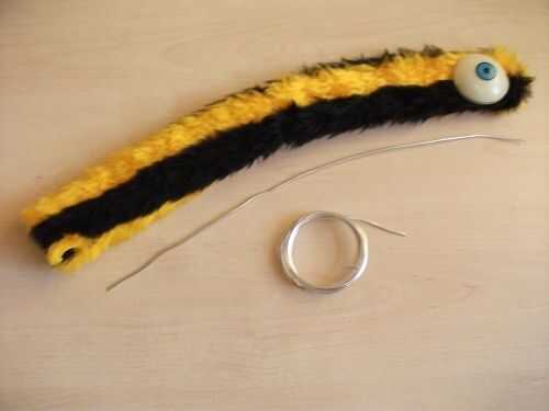 Así, cortar una longitud de apenas un poco más corto que el gusano de alambre y moldear las puntas encima con sus pinzas. Una vez que los extremos son rizados, inmersión en pegamento PVA blanco y doble un pedazo pequeño de material de desecho sobre los extremos, coser en el lugar. Esto es para asegurarse de que no hay ningún extremos puntiagudos dentro del cuerpo.