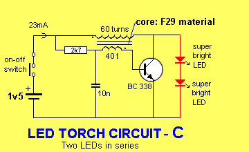 una linterna que hice fuera de un circuito de ladrón de joule simple, 2 ultra brite LED y una batería descargada.