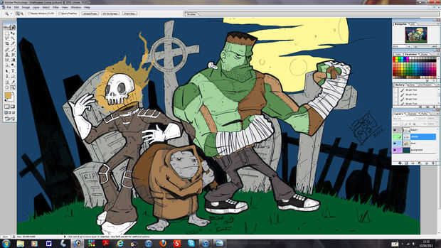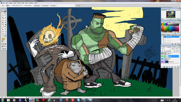 Ahora de las llamas color naranja de las llamas en la capa de pisos y luego borrar las líneas de tinta de la capa LINEART. Esto es simplemente porque se ve mejor que con un contorno negro sólido alrededor de él, coloreado las llamas con la opacidad baja para permitir que el color y el detalle del fondo a. La 2 º imagen acaba de agregar amarillo a la capa de sombra, también he añadido algunos más sombra a las lápidas y los personajes. No dude en añadir más capas de sombras y los resaltes, las capas más cuanto más puede volver y editar si algo sale mal.