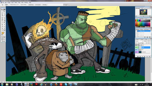 Luz y sombra añade mucho a una imagen, con esta imagen tenemos dos fuentes de luz. La cabeza llameante y la luna, si sólo de color las llamas sería ver ok pero no realmente retratar el calor o la luz viene de esta bola de fuego. Otra vez apagué las capas LINEART y sombra pues yo utilizaba la varita mágica para seleccionar todas las áreas que le toque la luz de las llamas. Para seleccionar más de un elemento con la varita mantenga pulsada la tecla Mayús mientras selecciona las áreas que se seleccionan destacar la capa de sombra que tu encima de todos los colores que has puesto hacia abajo.  Activar la visibilidad de capas LINEART, luego seleccione el pincel con el color naranja elegido, bajar la opacidad del pincel y añadir sólo un resplandor de luz a todas las áreas que usted piensa que debería ser resaltado. Iluminación y sombreado tarda una buena en mantener tan solo probar cosas diferentes, puede utilizar objetos en tu casa y mantenerlos lejos de una fuente de luz para ver donde se proyecta la sombra y que parte se destaca.