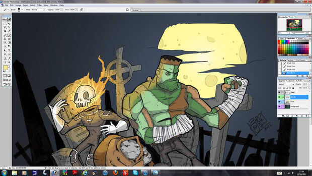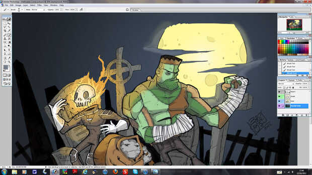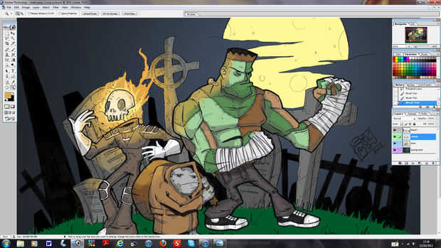 Ok asi que recuerda esa capa de fondo que hicimos años atrás, vamos hacia atrás a él ahora. Seleccione esa capa, tengo dos partes en este caso el verde de la hierba y el azul del cielo así que apagar todas las capas excepto la capa de fondo, hacer el combo selecto, de color y haga clic en el cielo. Vamos a utilizar ahora la herramienta Degradado, esto le permite a desvanecerse de un color a otro, así que elegí un color azul/gris y el segundo color un color negro/azul. Con esta herramienta es como trazar una línea, haga clic en dos puntos y los efectos cambian así jugar alrededor con ella. Hay un montón de opciones para cambiar pero yo uso la opción degradado Radial en la barra superior, esto dará el efecto de la luz viene de la luna consigue más oscuro de la luna el cielo es más. Después de que el cielo seleccione la luna en la capa de pisos nuevamente seleccione la capa de sombra por lo que es en la parte superior de su trabajo. Utilizando la herramienta de degradado otra vez cambiar el color 1 blanco, baje la opacidad y cambiar el gradiente al primer plano a transparente. Esto dará el efecto de mezclar el blanco en el color de fondo de la imagen, luego haz clic en el centro de la luna y arrastre a su efecto deseado.
