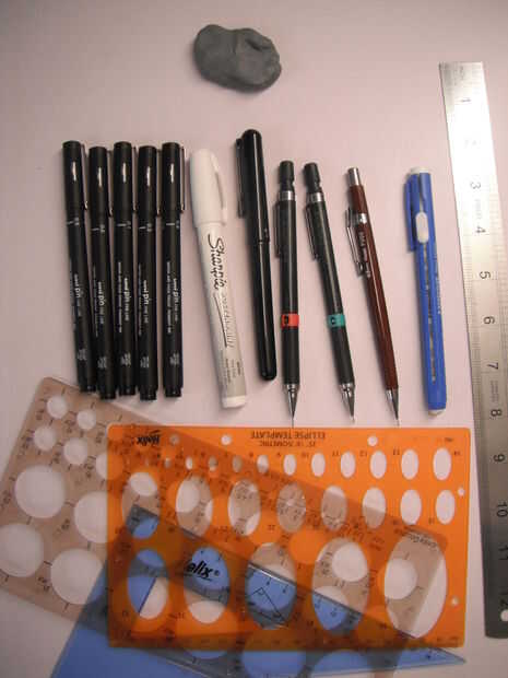 Estas son mis herramientas más usadas para el dibujo, me gusta mirar lo que otros artistas utilizan así que este es mi escondite. Yo uso portaminas 0.3 y 0.5 y luego azul mecánico en 0,7, A articulado capaz de eraser, una gama de tamaños de estilógrafos 0.1 - 0.8. Utilizar un cepillo de bolsillo Pental para mi entintado porque es grande y fácil de rellenar, utilizar tinta koh-i-noor también un cartel blanco de pintura Sharpie para resaltar en negro. Tengo plantillas para eclipses y círculos que siempre son útiles. Así que ahora que eso se hace vamos a pasar al dibujo!.