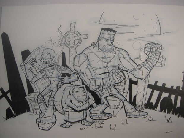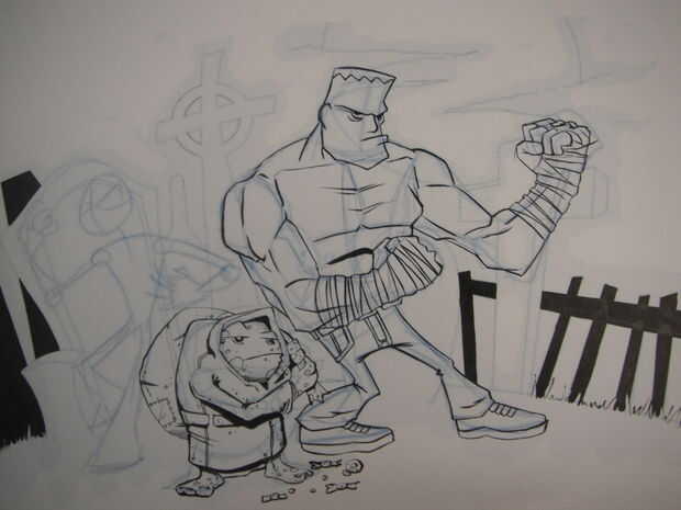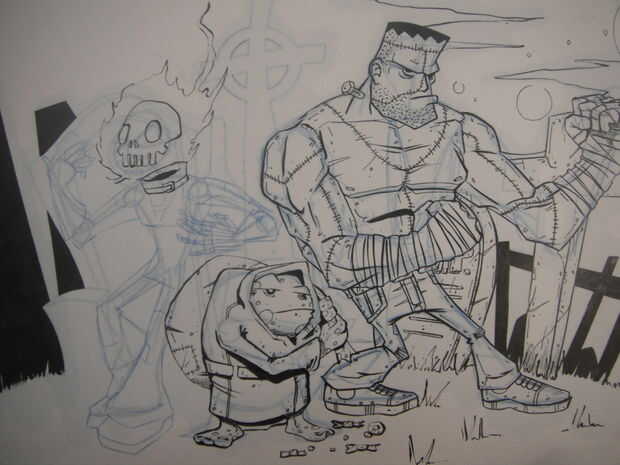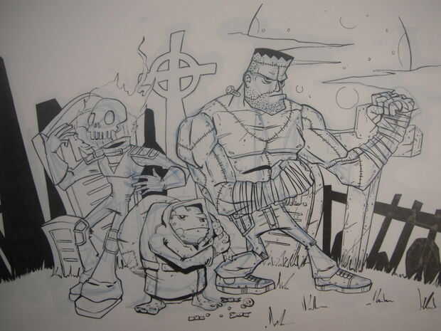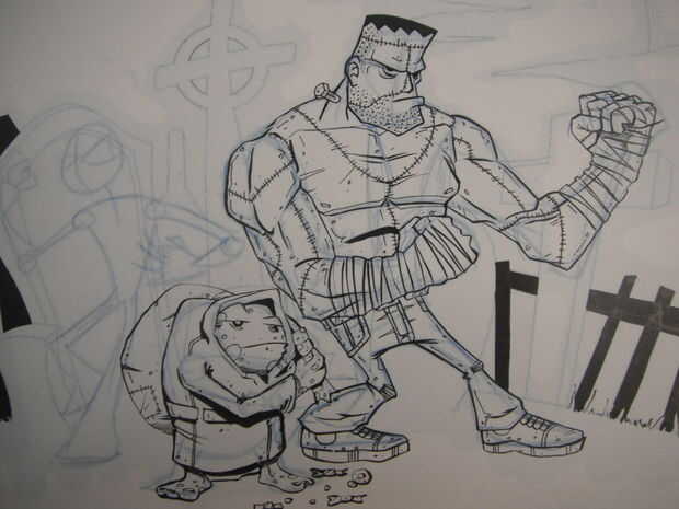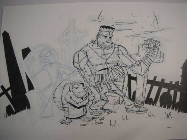 Repetir el mismo proceso para los otros personajes y fondo como se muestra en las imágenes que ha añadido. He añadido los músculos en el Frankenstein en lápiz azul antes de entintar el puesto necesitan más estructura que Igor, lamentablemente no puedo ir a estructura del músculo en este instructable ya que es un área muy grande, pero si quieren uno que estaremos encantado de hacer un par de diferentes en el futuro. Otra vez hacer los contornos de pental y detalles en el forro fino 0,1 para los personajes y fondos. Como se puede ver en una foto que estaba planeando hacer un personaje de cabeza de calabaza pero no se pudo obtener una cabeza con que estaba contento tan cambiado a una calavera llameante. Saqué la calavera llameante sin un boceto a lápiz porque yo no podía decidirme a veces al hacerlo con la pluma es más permanente y el dibujo es mucho más bruto e impulsivo. A veces tener la capacidad de borrar algo hace cuestionas mucho más y conseguir empantanado en los detalles.